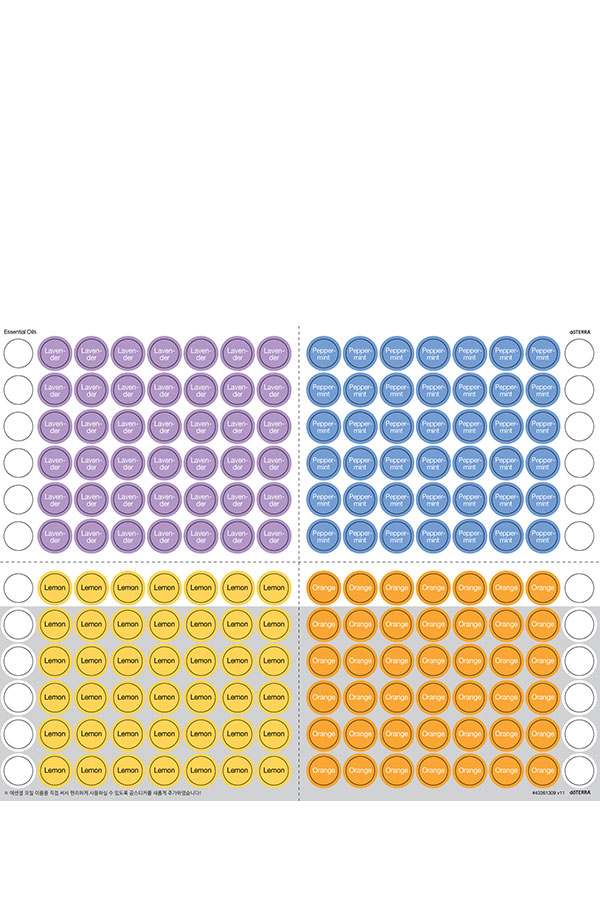 도테라 오일병 뚜껑에 붙이는 스티커 입니다. 영문과 국문으로 각각 제작되어 에센셜 오일별로 구분에 용이합니다. 해당 상품은 마이 도테라 오피스(www.mydoterra.com)에서 주문하실 수 있습니다.
